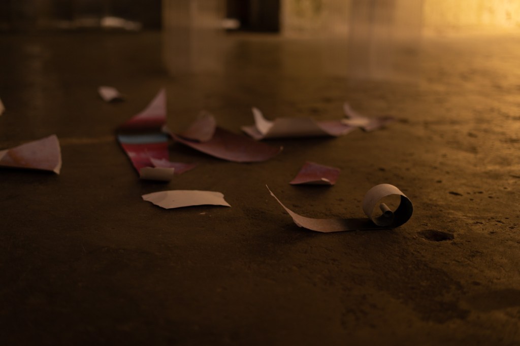 Los restos de la fotografía destruida pasaron a ser cuerpo expositivo, una escultura que cuestiona la permanencia y el valor de la imagen dentro del sistema del arte.