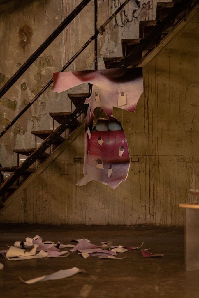 Durante la acción, destruí una fotografía de gran formato generada por mí mediante tecnología generativa, haciendo de sus restos una nueva escultura, cuerpo expositivo. En la imagen aparecía un rostro en el que era difícil identificar género o identidad. Al utilizar prompts que desestabilizaron las redes neuronales de la máquina (alimentada también por constructos culturales), fue posible generar un rostro híbrido, fracturado, que escapa de una definición fija.