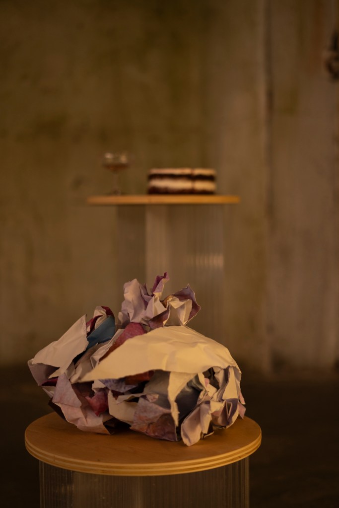 Mediante un llamamiento a través de RRSS, mujeres de todo el mundo me enviaron audios hablando de sus cuerpos, estos acompañaron sonoramente a la acción performativa. Se evocaba una visión casi trágica de lo festivo en homenaje a The Party (1995) de Georgina Starr y sus connotaciones ritualísticas, sociológicas y estructurales, en un paralelismo con la construcción del imaginario físico-mujer.